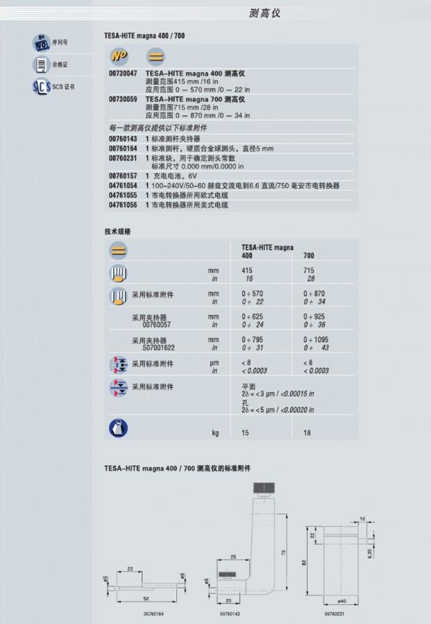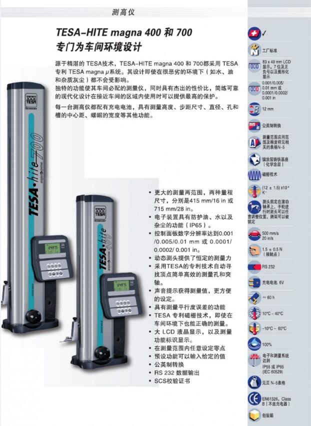 產(chǎn)品簡介 product presentation 商品名稱 瑞士 TESA 高度 儀 型號 TESA-HITE MAGNA 400/700 測量范圍 0-415/715mm 分辨率 0.001mm 供 應(yīng) 商 佛山市精測計量儀器設(shè)備有限公司 產(chǎn)品概述 product presentation TESA......